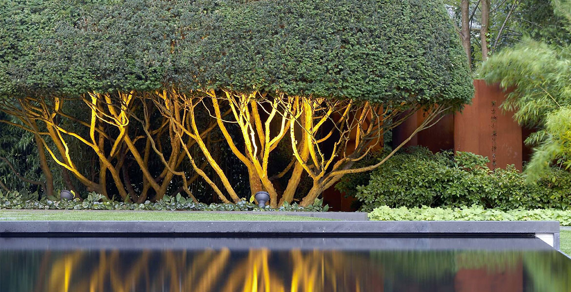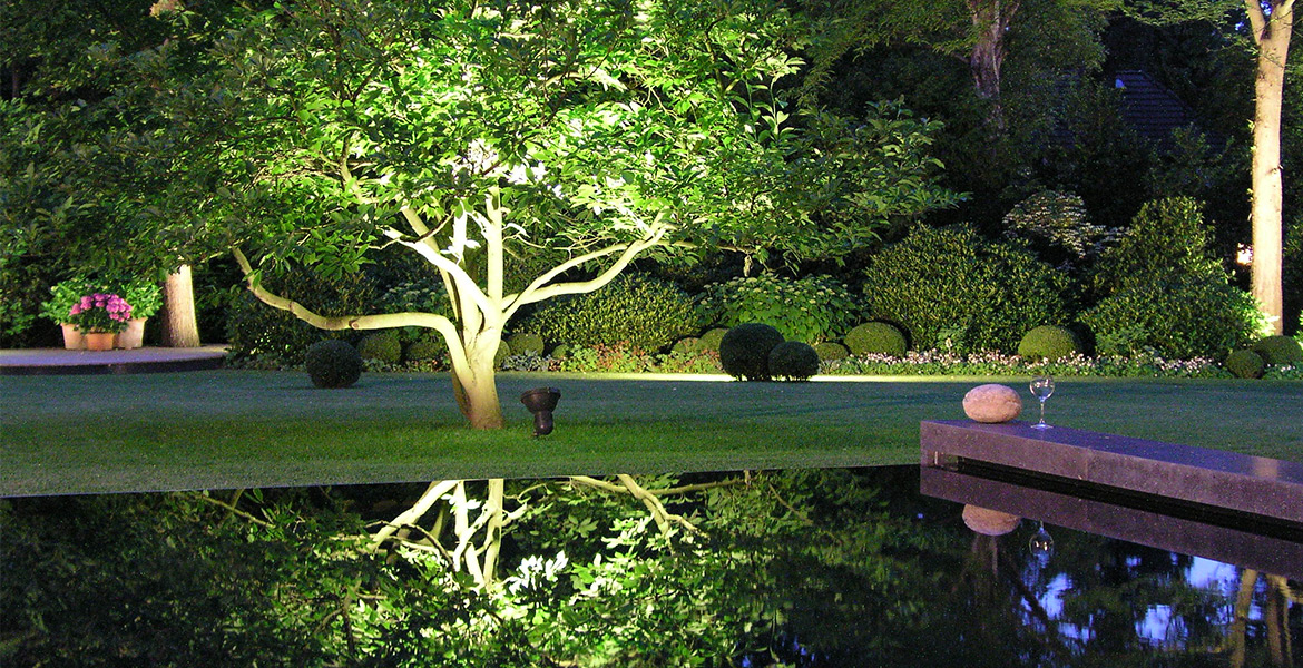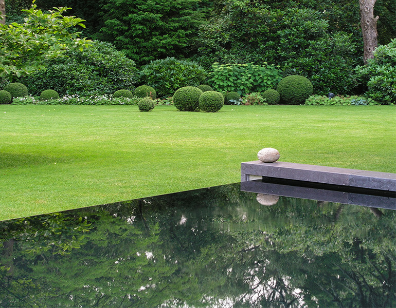 Das ruhige Wasserbecken mit seiner einzigartigen, viele Meter breiten Überlaufkante wird zum flächigen Spiegel im Garten. Diese Kante wurde als Bestandteil der Wassertechnik so konzipiert, dass lediglich ein gleichmäßiger, extrem dünner Wasserfilm in die dahinterliegende Rinne überläuft und alle auf der Wasseroberfläche treibenden Partikel mit der Strömung in die Filteranlage transportiert. Dadurch wird eine Trübung oder Verunreinigung des Wassers minimiert. Im Eingangsbereich des im Bungalow-Stil