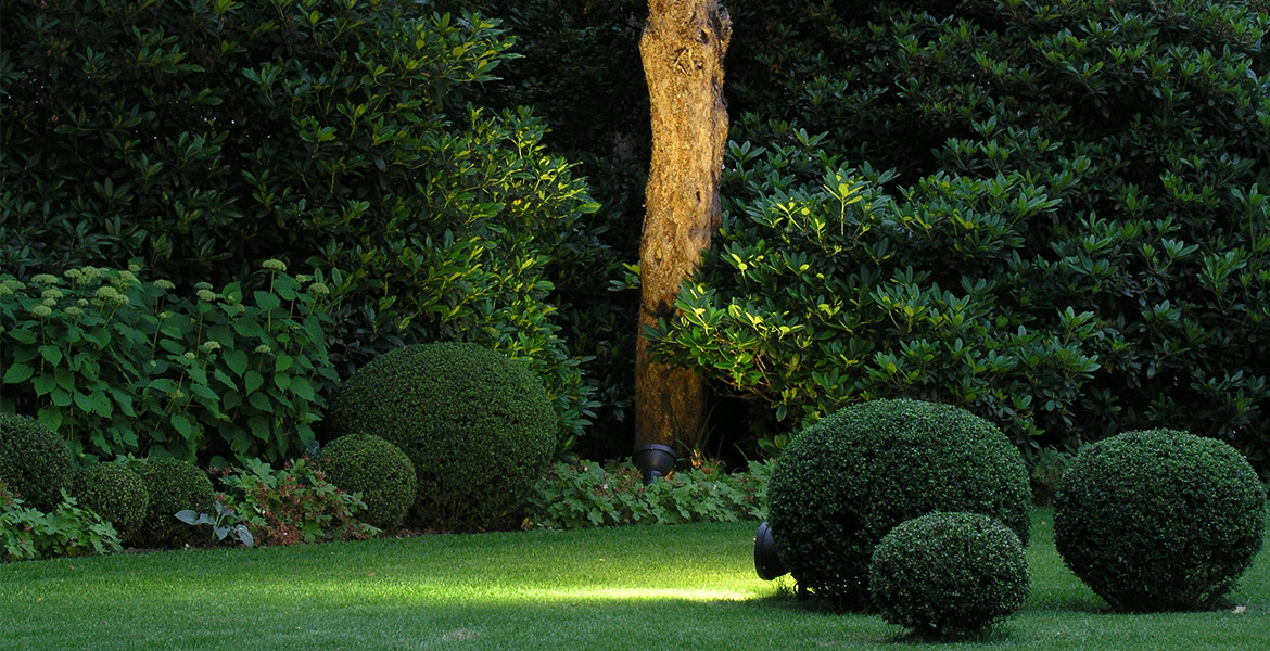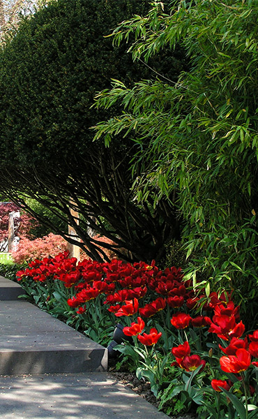 gehaltenen Hauses gab es an windigen Tagen häufig unangenehme Turbulenzen. Aus diesem Grund wurden, ähnlich wie am Rockefeller Center (New York) mannshohe Glasscheiben als transparenter Windschutz errichtet. Die bis in die Rasenfläche hinein gruppierten Buchsbaum-Kugeln unterschiedlicher Größen verdecken vom Haus aus die Scheinwerfer, mit denen die hintere Gartenkulisse illuminiert wird.