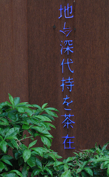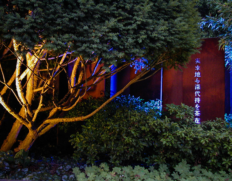 An besonderer Stelle des Gartens wurden Corten-Stahl-Bleche zu aufrechten Sichtschutz-Elementen geformt und partiell mit japanischen Schriftzeichen (ohne Bedeutung)
