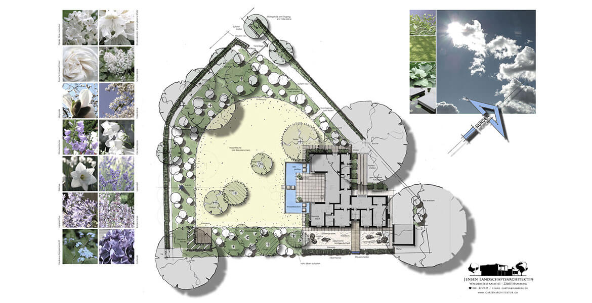 In den folgenden Planungsschritten wurde dieses Wasserbecken noch mit einer Überlaufkante zum Garten hin ergänzt. Die mittlere Reihe der Schrittplatten entfiel zugunsten der Großzügigkeit des Wasserspiegels.