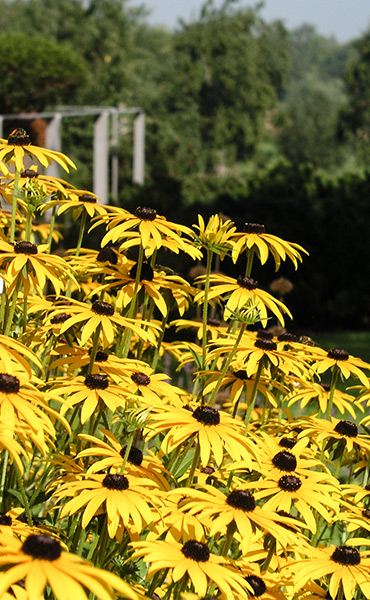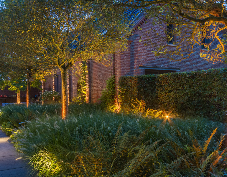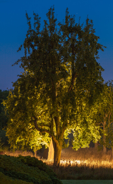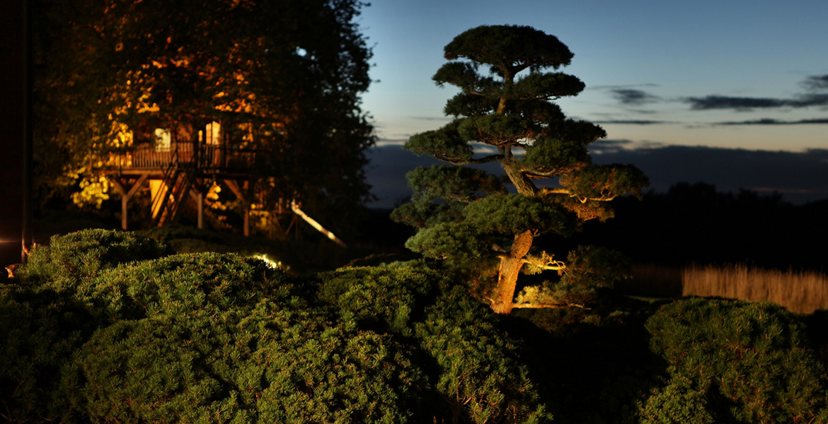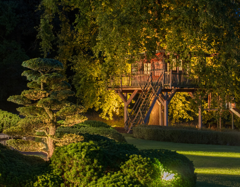 prägen. Die säulenförmig wachsenden Hainbuchen am Spielbereich, die original japanische, uralte Bonsai-Kiefer oder die ausgewachsenen Zierkirschen, deren Blüten sich im klaren Wasser des Teiches spiegeln. Alle Gehölze wurden sorgfältig in den Quartieren der Baumschulen gesichtet, ausgewählt und in diesen Garten verpflanzt. 2012 wurde der Garten durch die effektvolle Lichtinstallation der Firma Lumoto perfekt veredelt.