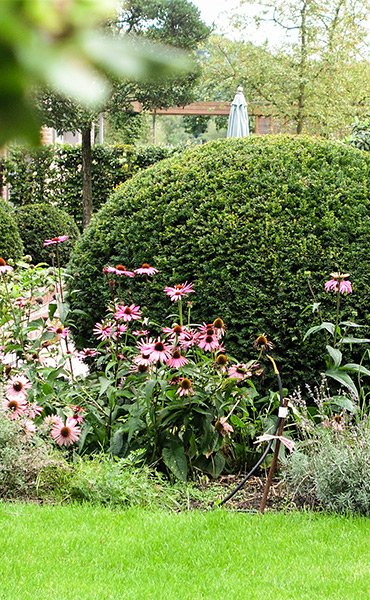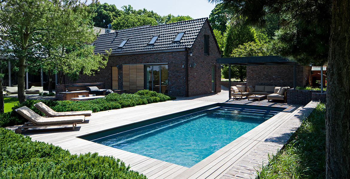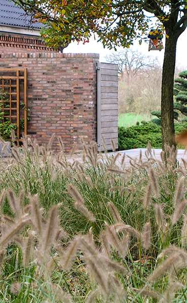 Am ehemaligen Wohnhaus des Hofes, welches heute die Eltern bewohnen, wurde ein blütereicher Bauerngarten angelegt. Ein kleiner Pool für heiße Tage mit der Möglichkeit, am Abend gemütlich in der Lounge-Gruppe beisammen zu sitzen, liegt hinter den ehemaligen, heute zum Arbeits- und Gästetrakt umgebauten Stallungen. Besonders erwähnenswert ist die Verwendung von einzigartigen großen Solitärpflanzen die den Raum entscheidend