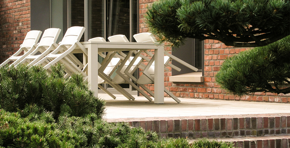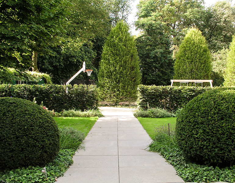 Stehen vor dem Haus exakt geschnittene Hecken, Kugeln und kleine Alleebäume in Reih und Glied, so prägen hinter den Gebäuden locker und wolkenartig gesetzte Kieferntuffs sowie eine amorphe Formensprache das Bild. In Gebäudenähe wurden Plätze und Terrassen mit hoher Aufenthaltsqualität entwickelt und angelegt. Für die Kinder