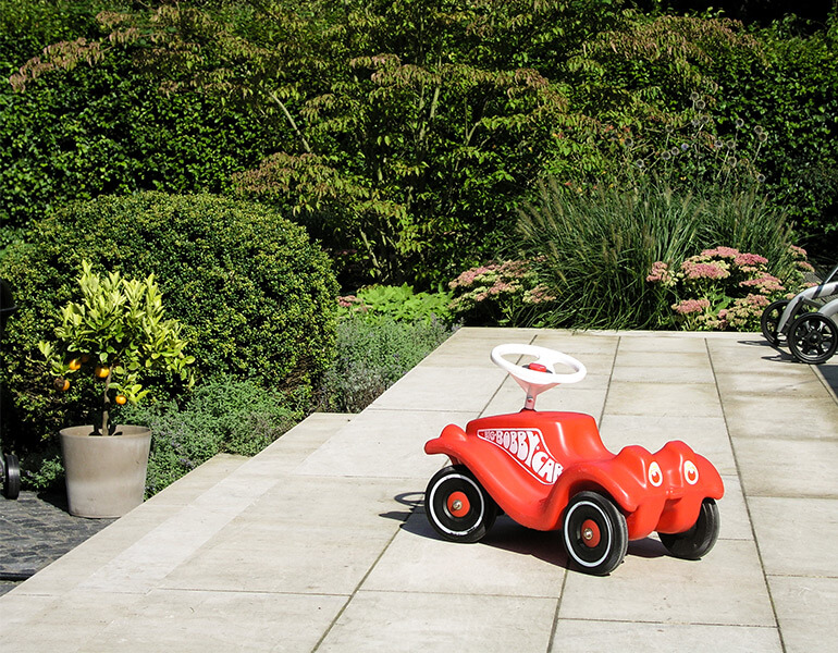 Erwachsenen verdient der von uns so genannte „Regieplatz“: ein Ort im Garten, von dem aus man ohne „tote Winkel“ einen möglichst kompletten Überblick auf das gesamte Geschehen hat. Dieser Platz ermöglicht es Aufsichtspersonen, ruhig und stressfrei ihrem „Job“ nachzukommen. Gerade für Oma und Opa, für Eltern oft eine unverzichtbare Hilfe beim Einhüten, sind diese Plätze willkommen. Oft reicht eine Mini-Terrasse mit einer bequemen Bank oder einem Gartensessel an der richtigen Stelle völlig aus.