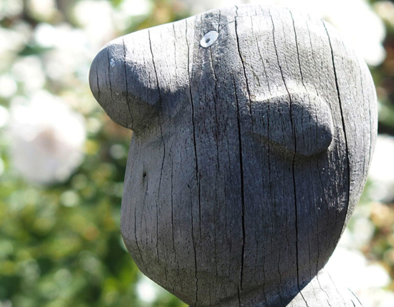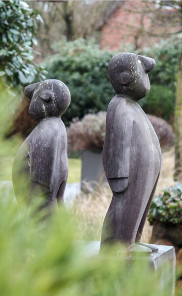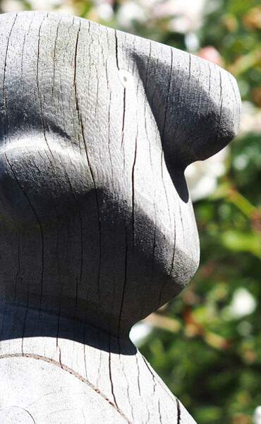 dieser Garten nun sowohl im Sommer zur „blauen Stunde“ wie auch in der kalten Jahreszeit unglaublich stimmungsvoll illuminiert. Einige schön ergraute Eichenholz-Skulpturen des Krautsander Künstlers Jonas Kötz heißen Besucher und Gäste subtil willkommen. Sie bereichern die Szenerie als stumme Beobachter.