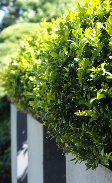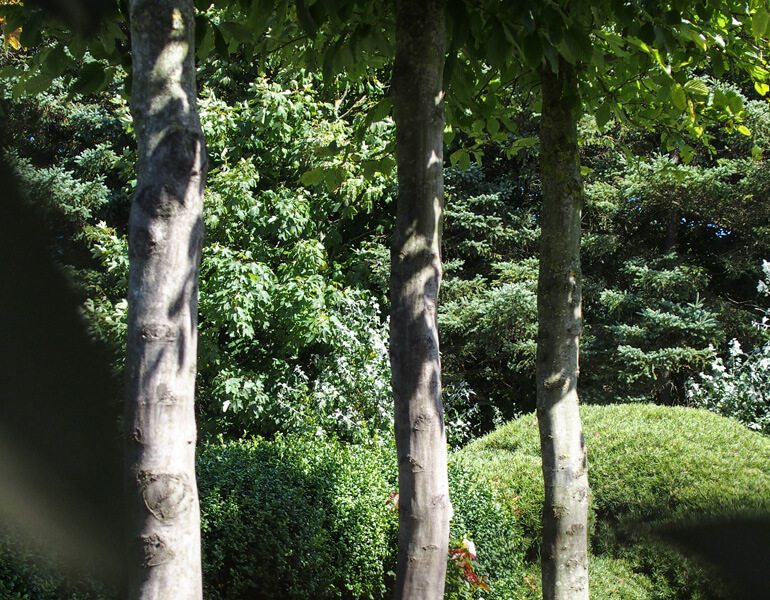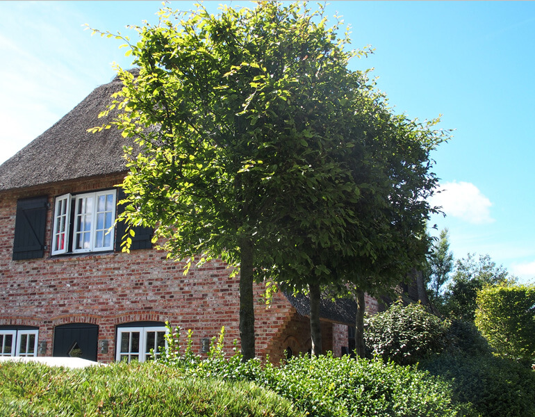 Insgesamt bilden zwölf kastenförmig geschnittene Hainbuchen den Rahmen und den Sichtschutz für diesen Garten. Weitgehend unüblich für Sylter Gärten ist die streng gerade,