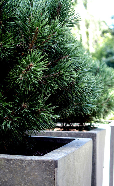 Konzept integriert werden. In diesem Zuge wurden die Beet-, und Rasenflächen auf Wunsch der Auftraggeber dem neuen Stil angepasst, orthogonal begradigt und mit einer breiten Großpflasterzeile aus Basaltsteinen eingefasst. Diese dient nun auch den Rasenmährobotern als befahrbare Kante und ermöglicht so das randscharfe Mähen.