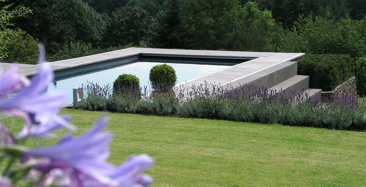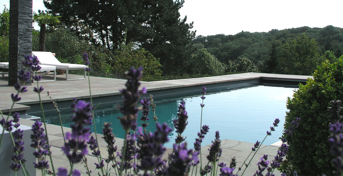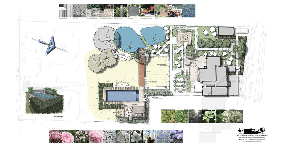 Auf dieser anspruchsvollen Topografie eine große Poolanlage zu platzieren, war die Planungsaufgabe an unser Team in Hamburg. Vergleichbare Situationen sind uns Hanseaten von Grundstücken am nördlichen Geesthang der Elbe (z.B. Elbchaussee, Blankenese etc.) sowie auch von anderen Projekten in Deutschland und Europa bestens vertraut. Die ungewöhnliche Idee war, den Pool nicht quer zum Hang, sondern um 90 °