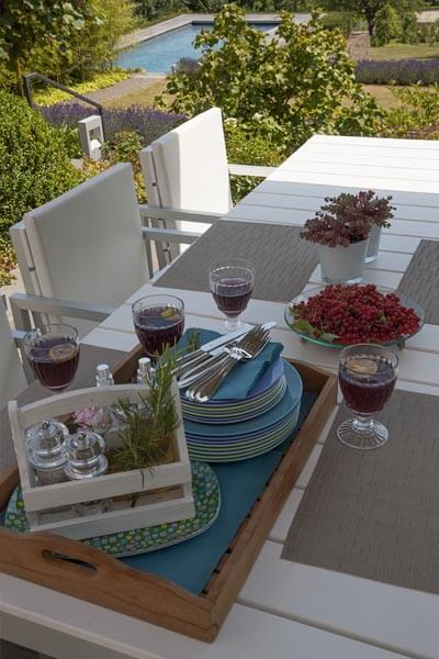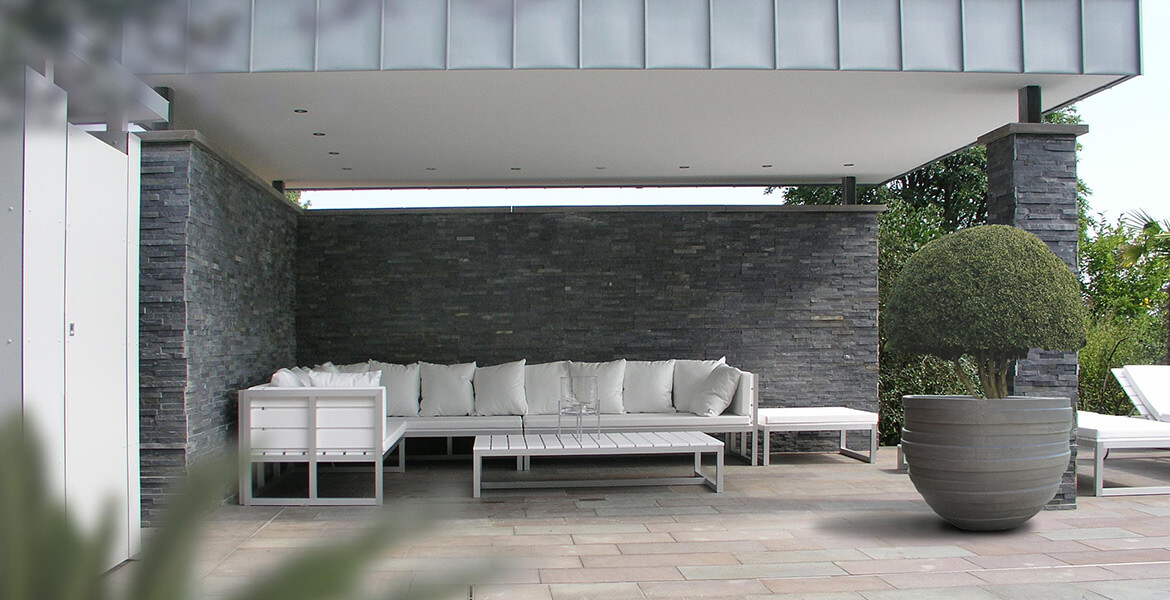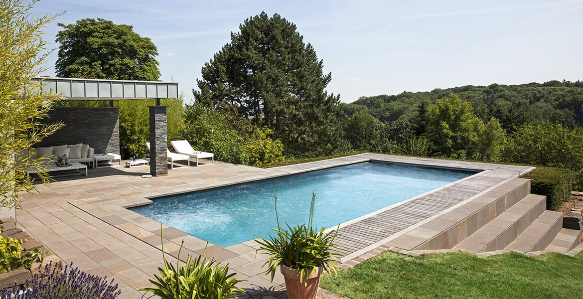 Neben der Poolanlage entstand eine großzügige, überdachte Lounge-Terrasse, sowie eine Umkleide- und Duschmöglichkeit. Als Material für Wege, Stufen, Mauern und Terrassen wurde ein regionales Material gewählt: Lindlaer Grauwacke. Spektakulär vollzog sich der Einbau des Pools mittels Autokran, der sich mitsamt dem Transportfahrzeug für den Pool mühsam seinen Weg durch die schmalen Gassen des Ortes hoch zur Baustelle erarbeiten musste. Das Einheben des Ein-Stück-Beckens der Firma Riviera über das Haus