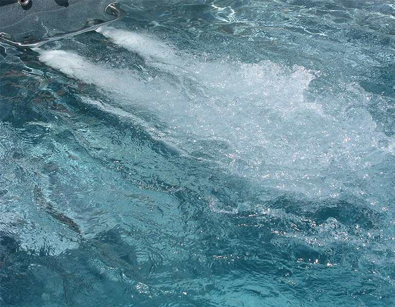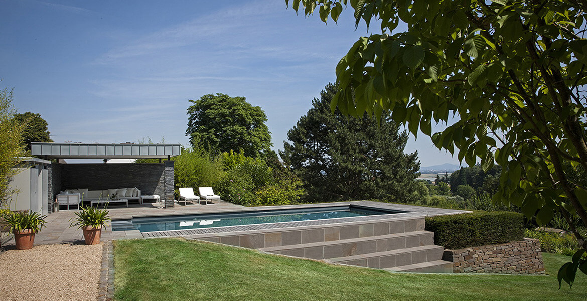 gedreht direkt in Richtung der Rheinebene zu setzen, um somit den einmaligen Ausblick und die Schwimmrichtung überein zu bringen. Bei der Länge des Beckens (zwölf Meter) hatte dies zur Folge, dass sich der Wasserspiegel auf der hangabwärts gerichteten Seite nun in einer Höhe von fast drei Meter über dem Erdboden befindet. Das Becken wurde mit Natursteinmauern und Arena-artigen Sitzstufen gestützt.