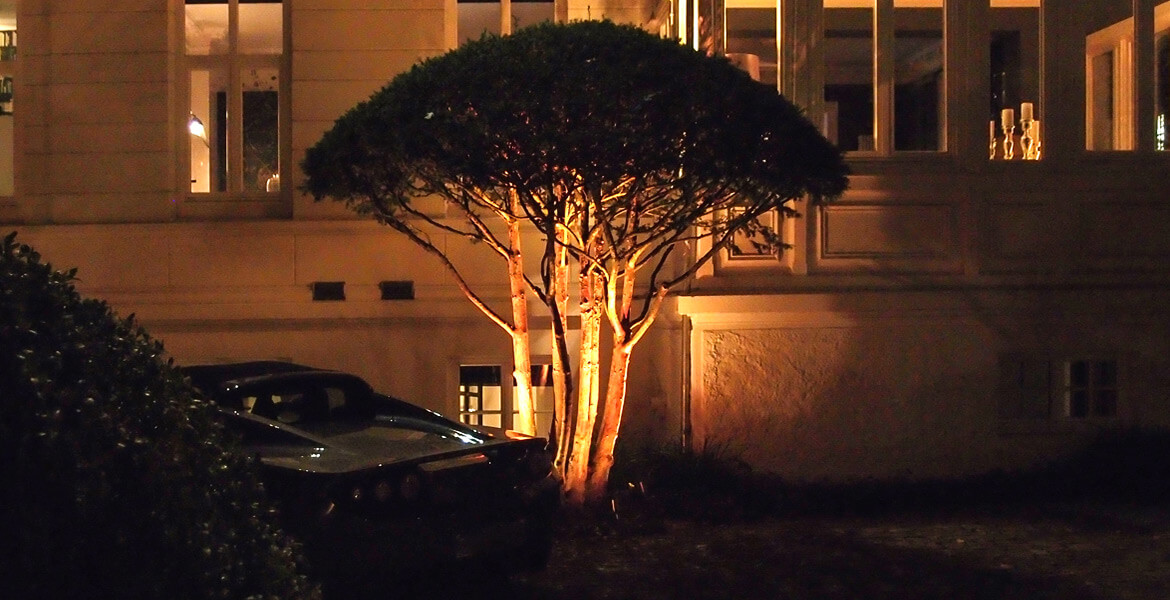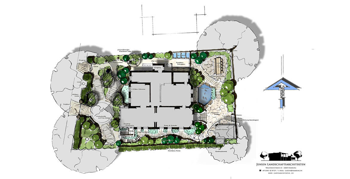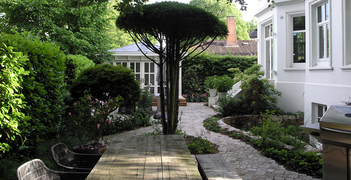 Für die Auswahl der Bepflanzung des Gartens wurde sehr viel Zeit verwendet. Hier galt es, neben ganzjährigen Blühakzenten eine möglichst immergrüne, starke Mixtur zu finden, die neben üppigem Wachstum der einzelnen Arten und Sorten dennoch eine eher friedliche Koexistenz ohne evolutionäre Konkurrenz ermöglicht (Garten von Ehren). Die kommenden Jahre und die Qualität der Gartenpflege werden zeigen, ob es gelingt, diese „geordnete Wildnis“ im Sinne der Planungsidee zu entwickeln. Die befahrbaren Flächen stehen im wahrsten Sinne unter der „Schirmherrschaft“ der drei mehrstämmigen Eiben.