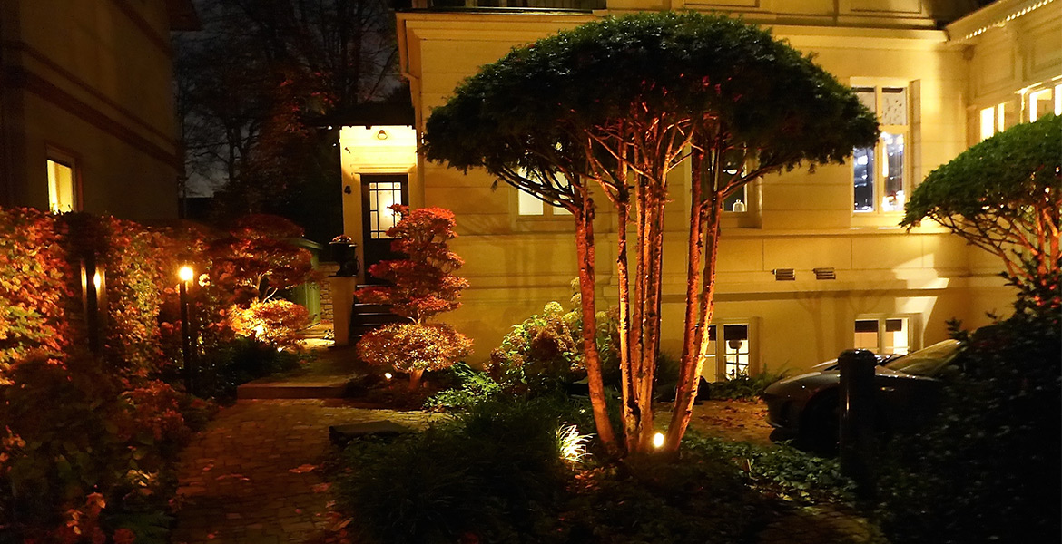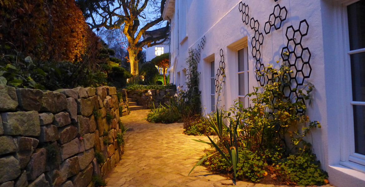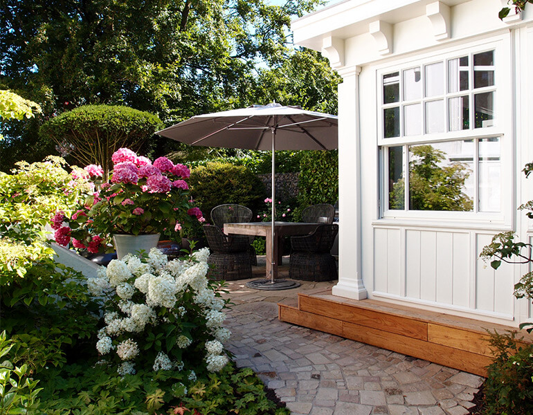 „Kachelgrundofen“) installiert. Vertikal zu schiebende Fenster auf der Westseite erinnern an England oder Amerika. Dieses Haus wurde als Einzelstück von der Firma Manufaktura Paulini nach unserer Planung erstellt. Eine spezielle Farbe schützt das Holz für viele Jahrzehnte. Dieser Garten wurde in 2014 fertiggestellt. Perfekt abgerundet wird das Bild mit der Beleuchtung der Firma Lumoto.