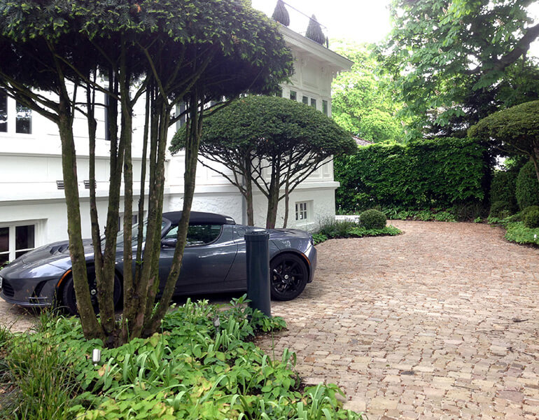 wie man das noch von früher her kennt (oder von Sylt), in einem polygonalen Verband gesetzt, in dem wie zufällig kleine Nester aus Pflastersteinen integriert sind. Alle Pflasterflächen, ob begeh-, oder befahrbar, wurden aus einer Mischung verschiedener Formate komplett ohne sichtbare Einfassungssteine hergestellt (Fa. Stone & Garden).