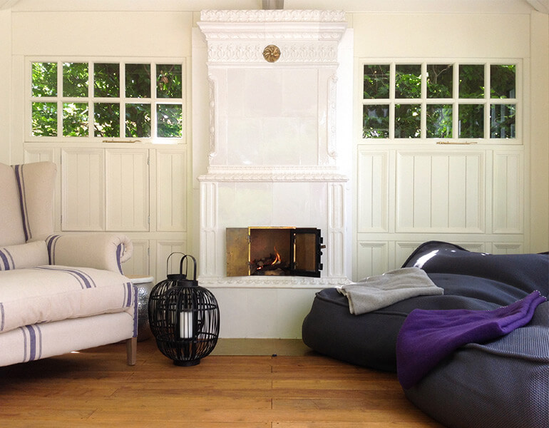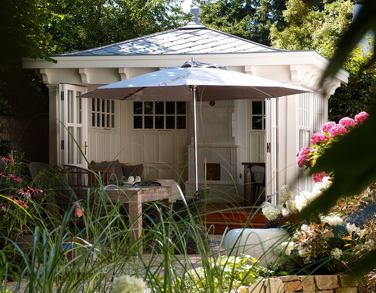 Hauptattraktion jedoch ist das Gartenhaus, welches in Anlehnung an den Stil der neuenglischen Architektur des ausklingenden 19. Jhd. geplant wurde. Daher war der Arbeitstitel lange Zeit „Porch“ oder „Teehaus“. Mit einer mittels Faltschiebefenster ganz zu öffnenden Front ist dieses Gartenhaus sowohl bei gutem als auch bei unserem häufigen hamburger „Schietwedder“ zu nutzen. Für die Herbst-, und Winterzeit, aber auch für lange Sommerabende wurde von Firma SVEA ein original schwedischer Kachelofen (richtig: