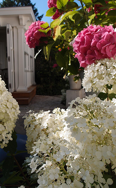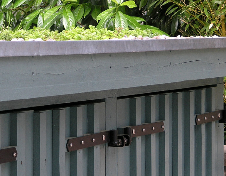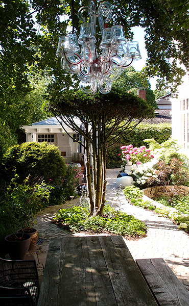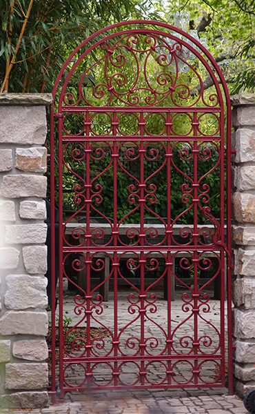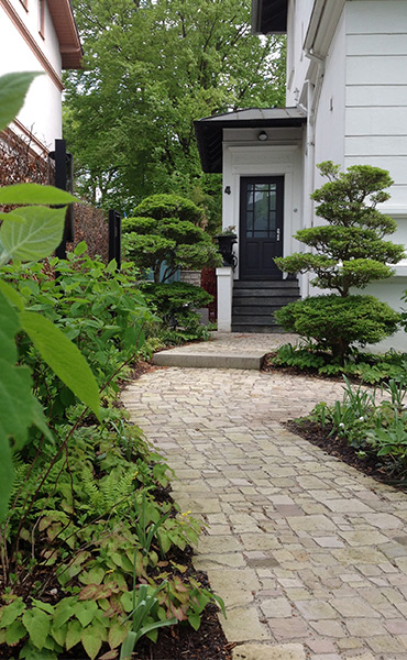 Diese Unikate prägen das individuelle, räumliche Bild vor dem Haus und vermitteln die Stimmung der eingangs erwähnten Planungsaufgabe. Zu den individuellen Ausstattungs-Detail des Gartens gehören neben einem wunderbaren, individuell geplanten, schmiedeeisernen Gartentor in blutrot (Schmiede Lehmann) auch ein herrlich rustikaler Gartenschrank (Gätje Holzaußenanlagen) mit Dachbegrünung als Ersatz für das ehemalige Gartenhaus der Vorbesitzer.