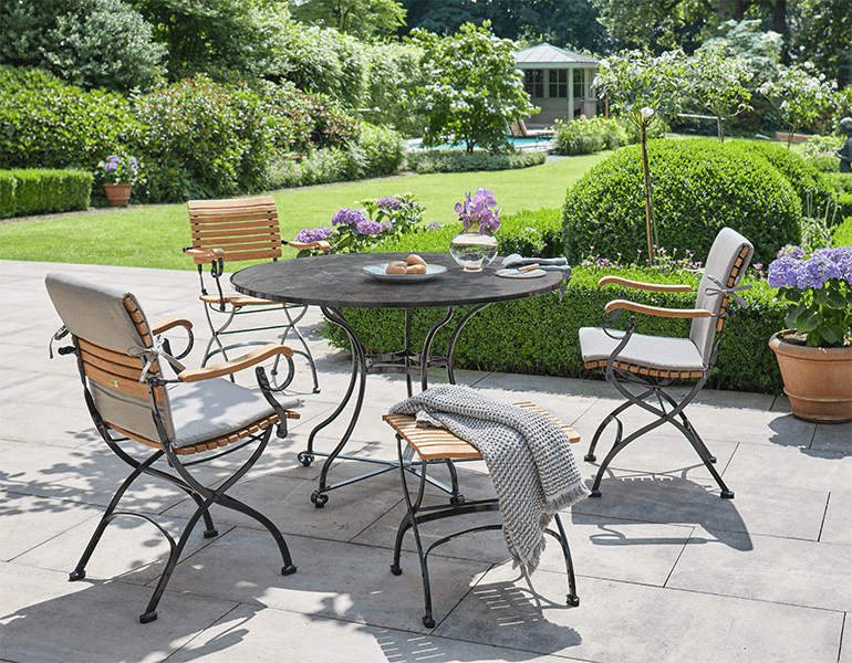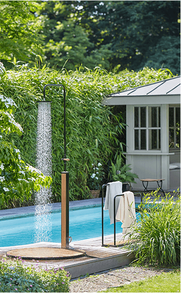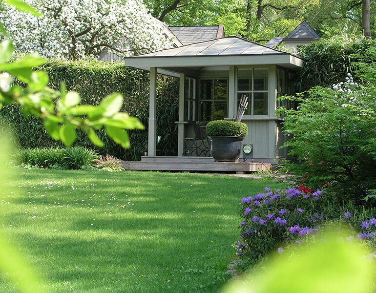 Der Pool als zentrales Element für die Familie wurde bewusst nach hinten in den Garten gesetzt, um die intensive Nutzung nicht zu nah am Haus zu haben. Er wurde mit einem individuell geplanten Poolhaus ergänzt, welches auch die Möglichkeit zum Umkleiden bietet und für die Unterbringung von Poolzubehör dient. An diesem Punkt entstand mit dem Poolhaus ein überdachter Gartensitzplatz in der Abendsonne, von dem aus wie von einem „Regieplatz“ der ganze Garten und das Haus vor einem zu sehen sind.