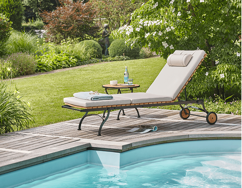 Das Poolhaus diente später als Vorlage für das Garten- und Saunahaus der Firma Garpa. Das Fertigschwimmbecken von Riviera Pools wurde als komplettes Bauteil mit einem Autokran in den Garten gehoben und anschließend mit einem edlen, umlaufenden Teakholzdeck versehen. Ein Maulwurfsgitter schützt den Rasen vor unerwünschten Besuchern. Wegen der Größe des Grundstücks sollte die Bepflanzung im hinteren Bereich möglichst pflegeleicht angelegt werden.