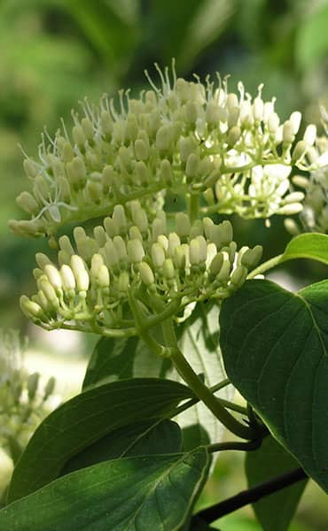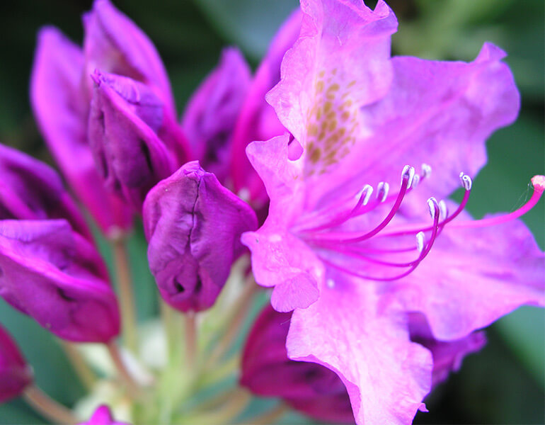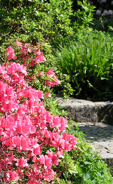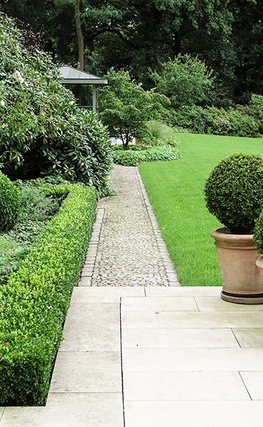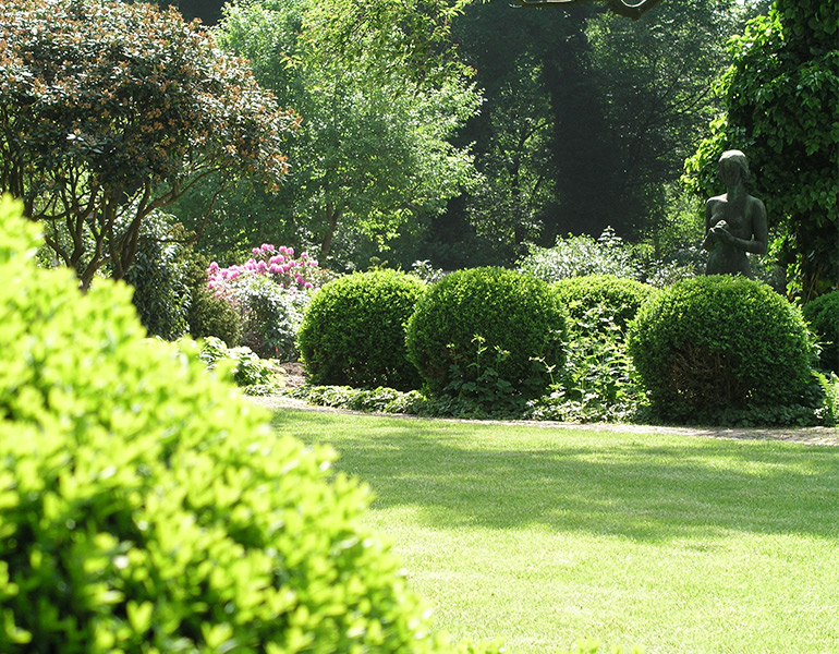 Die Beetflächen wurden dort mit robusten, bodenbedeckenden Stauden wie z.B. Elfenblume, wintergrüner Storchschnabel oder ungarische Golderdbeere bepflanzt, in kühl-schattigen Lagen nahe der großen Rhododendren auch mit Farnen und Waldgräsern. Vor der Terrasse wurden zwei große symmetrische, von Buchshecken gesäumte Zierbeete mit großen Buchsbaum-Kugeln, Hochstammrosen, Katzenminze und anderen Blütestauden
