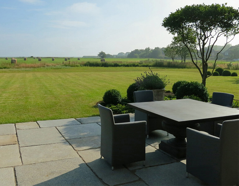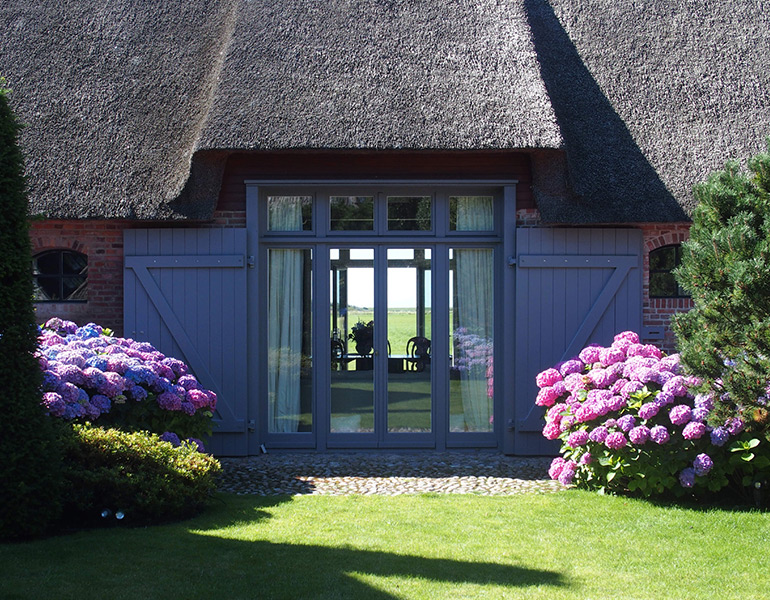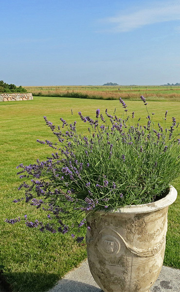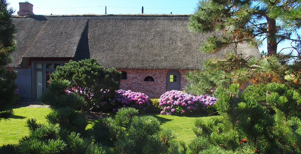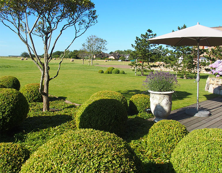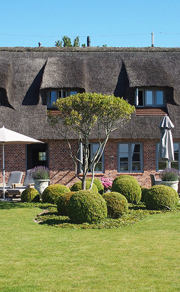 wurden die Blütepflanzungen durch wolkige Formationen aus Zwergkiefern und einzelne, schirmförmig gezogene Krummholz-Kiefern (Pinus mugo mughus). Die Terrassenflächen sind (passend zum ländlichen Charme der Reetdächer) mit gebrauchten, großformatigen „Krustenplatten“ befestigt worden.