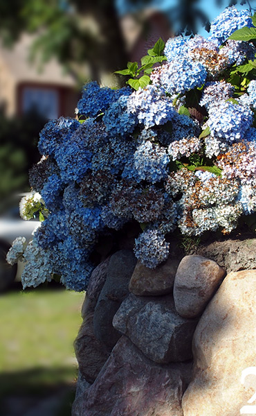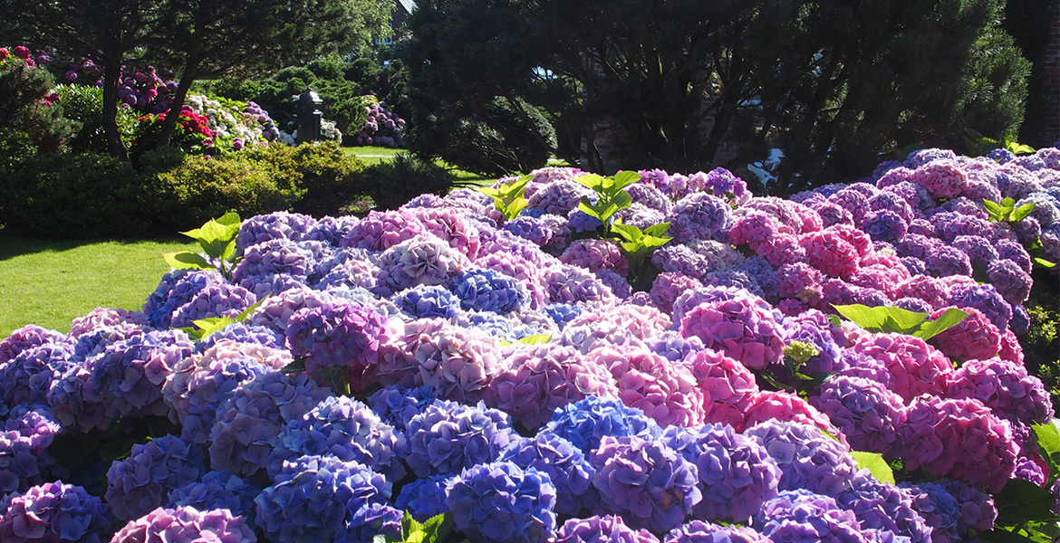 Die hinsichtlich Blütereichtum und -dauer alles überragende Bauernhortensie wurde in großen Formationen gesetzt, um die kolossale Wirkung insgesamt noch zu erhöhen. Von Juni bis weit in den Herbst hinein bilden sie nun ein einziges Blütenmeer. Stellenweise ist kein grünes Blatt mehr zu sehen. Als Frühlings-Vorbote wurden zwischen den Hortensien größere Gruppen aus Azaleen (Rhododendron) „Purple Splendor“ gepflanzt. Eingerahmt