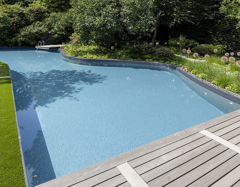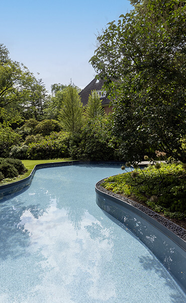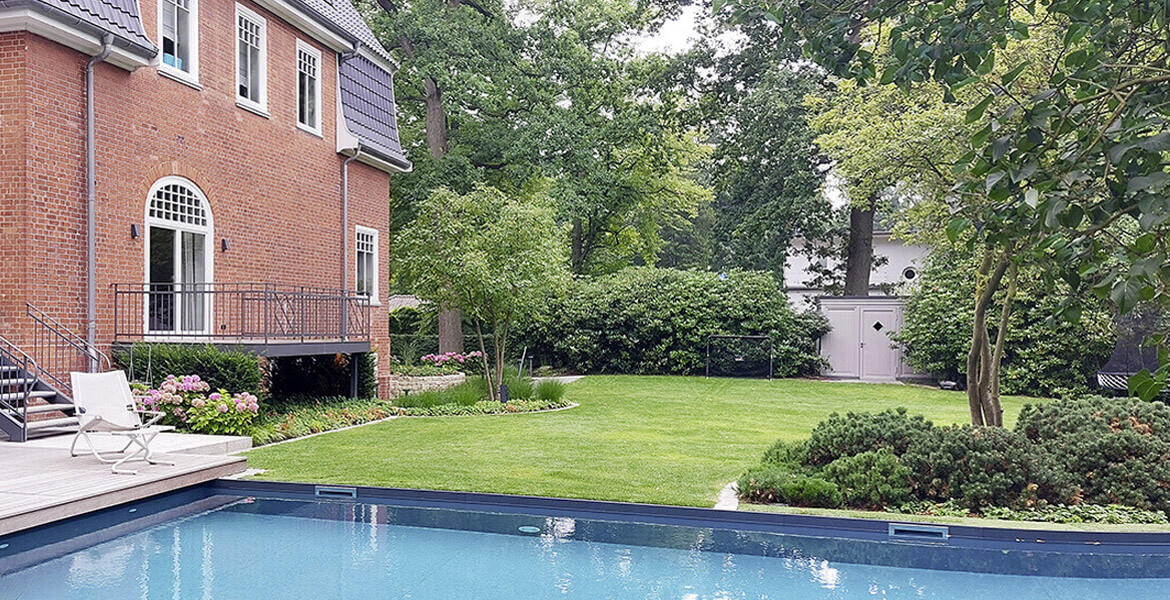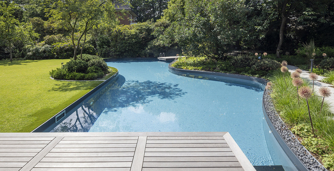 In unserer ersten Planungsbesprechung mit den Kunden, bei der in der Regel die Aufgabenstellung formuliert und abgestimmt wird, wurde auch das Thema „Schwimmen“ angesprochen. Wer im eigenen Garten schwimmen möchte, hat heute eine große Auswahl an Möglichkeiten. Musste man sich vor ein paar Jahrzehnten noch zwischen A und B, also Pool oder Teich entscheiden, so sind die Grenzen mittlerweile nahezu fließend geworden und es gibt viele Hybridformen: amorphe Teichformen lassen sich kombinieren mit Profi-Pooltechnik, Schwimmteiche mit natürlich-pflanzlichen Retensionsflächen können als rechteckiger „Naturpool“ gebaut werden u.s.w.