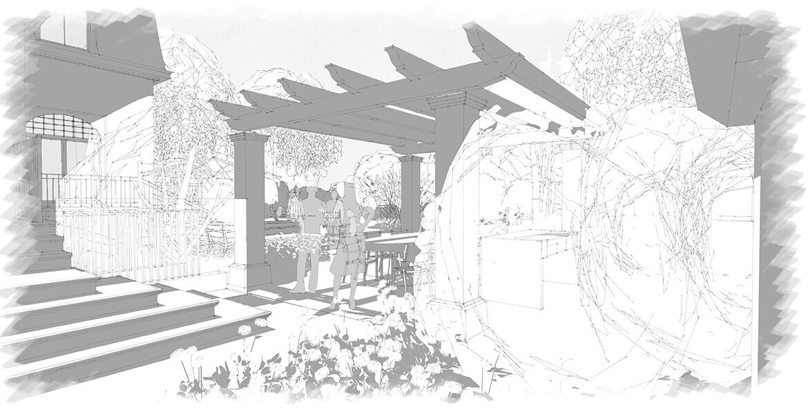 Enthielten die ersten Planungsideen aufgrund des Kundenwunsches noch eine klassisch-längliche Poolform, die entweder parallel oder im 90°-Winkel zum Gebäude im Garten platziert war, so wurde anhand dieser Skizzen schnell klar, dass sich eine solche Form nicht optimal in den bestehenden Garten einpassen würde, denn sie hätte den Garten eher geteilt als bereichert. Auch entsprach ein im Winter dauerhaft abgedeckter Pool nicht dem gewünschten Ziel der ganzjährigen optischen Attraktivität (Blick aus dem Panoramafenster).