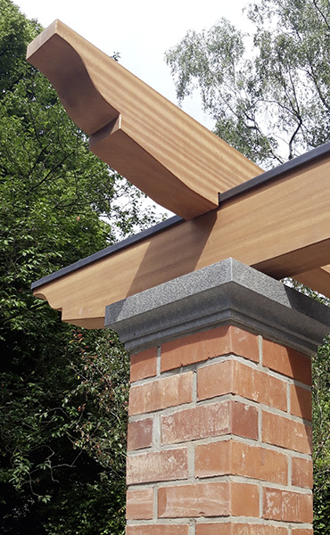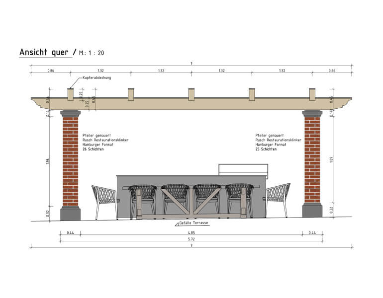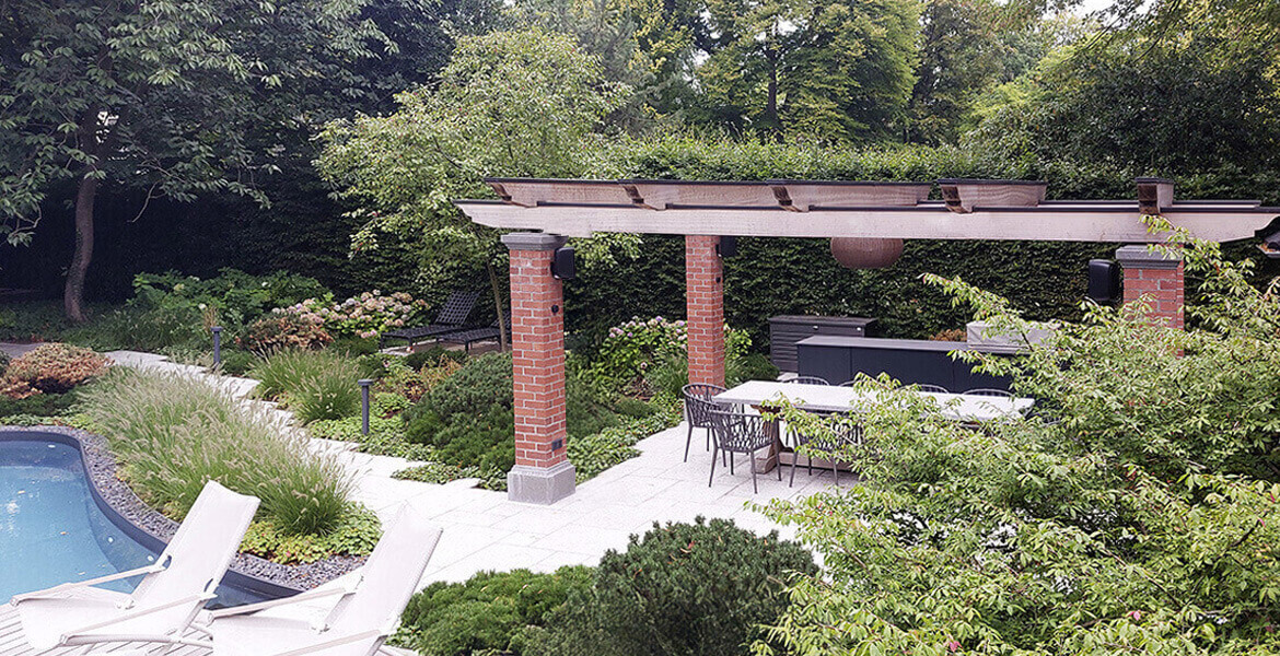 Eine anspruchsvolle planerische Herausforderung war die Positionierung der neuen Terrasse sowohl mit direkter Anbindung an die auf der Nordseite des Hauses gelegene Küche als auch optimaler, sonniger Lage im Garten. Eine neue Podest- und Treppenform wurde entwickelt, um die Höhendifferenz zwischen dem Erdgeschoss und dem Garten möglichst elegant zu überwinden. Unterhalb dieser neuen Treppe mit Austrittspodest vor der Küche liegt nun der Raum für die Pooltechnik. Die Terrasse wurde mit antikisierten Granitplatten im römischen Verband belegt und mit geklinkerten Mauerpfeilern und einer schönen Holz-Pergola räumlich gefasst. Der familiengerechte XXL-Tisch mit Blaustein-Platte wurde bereits häufig in großer Runde und mit Freunden genutzt. Als absolut sinnvolle Ergänzung hat sich die fest installierte Gartenküche bewährt.